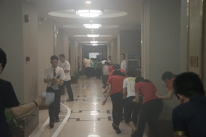 此次演練主要模擬酒店三樓包房發(fā)生火災,針對此情況進(jìn)行火情報警、傷員救助、安全疏散和滅火器的使用四項內容進(jìn)行演練。