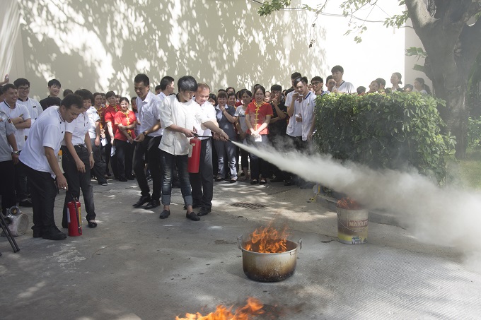 二、讓全體員工聚集在一起,演示了防毒面罩、消防水袋及干粉滅火器的使用方法。